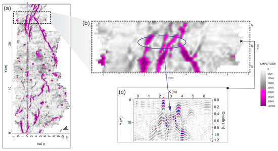 (a) Depth slice (50 cm) of the pseudo-3D block; (b) Detail of the pseudo-3D block depth slice showing anomalies from a set of roots; (c) 2D profile (position 26.2 m) with the respective reflection from a set of roots (RP-2). The x symbol (red) represents the steel-cable anomaly used in section georeferencing.