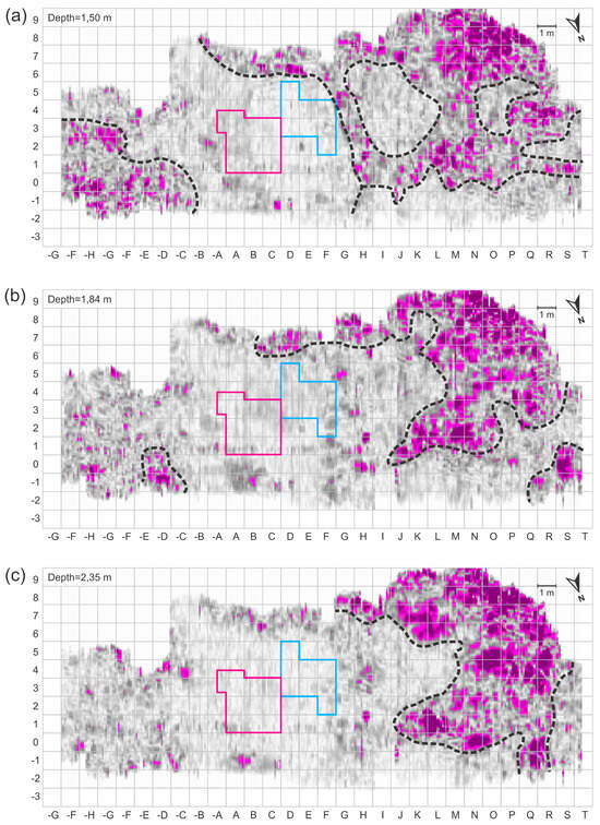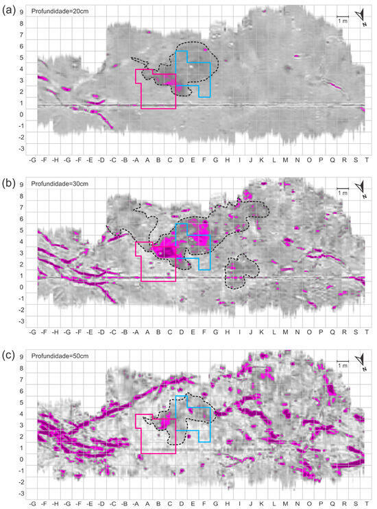 After characterizing the reflection patterns and consequently developing knowledge about the nature of the main anomalous responses, interpretation proceeded regarding anomaly mapping. The generated depth slices were plotted in relation to the grid demarcation of the excavation area initiated by researchers from the Pontifical Catholic University of Goiás (PUC Goiás) up to the date of writing. This ongoing excavation is marked in the figures by pink and blue markings, with pink marking referring to excavation Area 1 and blue referring to excavation Area 2 (from the Serranópolis Project collection).