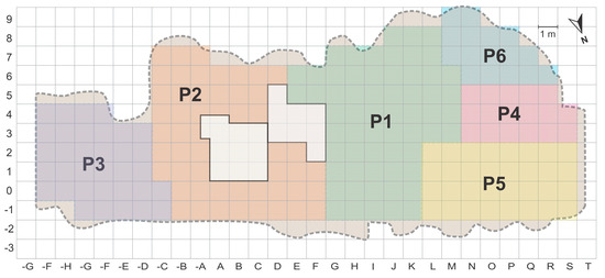 Sketch highlighting six priority excavation regions (P1–P6), identified through the grouping of the weighted sum of factors considered for each grid.