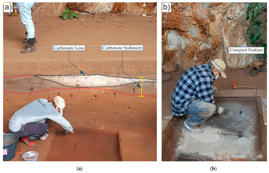 Field photographs showing two different contexts of the carbonate layer: (a) Profile in the excavation area, approximately 60 cm deep, highlighting the carbonate sediment package with the presence of a carbonate layer lens at 20 cm depth. (b) Excavation in an area where the “compact feature” was found at 20 cm depth, generated from the contact between the carbonate layer and hearth ashes.