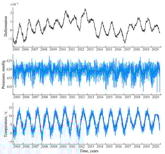 Long-term experimental data recorded by the Baksan laser interferometer–strainmeter of the MSU SAI; from top to bottom, lithospheric deformation (strain) along the measuring arm (75 m) and atmospheric pressure and temperature at the instrument installation point. The black lines show seasonal variations [].