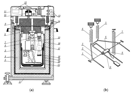Stationary quartz gravimeter SKG-M []: (a) general schematics: 1—set screws; 2—base; 3—housing; 4—heat-insulating cover; 5—thermostat; 6—permalloy magnetic shield; 7—screw for setting the measurement range; 8—mounting sleeve; 9—mounting plate; 10—micrometer sensor; 11—control unit housing; 12—control unit; 13—power connectors and output to the recorder; 14—heat-insulating gaskets; 15—calibration mirror; 16—illuminator of the pendulum mirror; 17—internal mounting plate; 18—differential photocell; 19—protective case of the sensitive system; 20—sealing device; 21—quartz sensitive system; (b) quartz sensitive system: 1—quartz threads; 2—measuring frame; 3—twisted threads; 4—measuring spring; 5—range spring; 6—mirror; 7—main spring of the system; 8—lever of the main spring; 9—pendulum suspension.