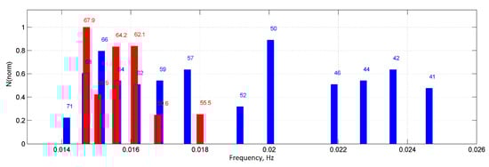 The data of the Baksan laser interferometer–strainmeter allow, at a qualitatively new level, the study of wave processes in a layered lithosphere complicated by local magmatic structures. Spectral analysis of crust deformations allows us to investigate the resonance features that can be associated with characteristic dimensions of local geological structures []. The long-term monitoring of lithospheric deformations allowed us to process representative (more than seventy) records of earthquakes. The method of processing the extremely low-frequency deformation records was as follows: After the arrival of seismic P wave, a four-hour time series was extracted from the full deformation record with a ten-minute delay. The delay was determined by the expected rocks’ Q-factor (attenuation time) of the seismic S wave. The spectral analysis of the obtained time series was used to identify the modes that could be considered as resonant. When statistically averaged over a set of earthquakes, some of these modes were grouped into rather stable families with a pronounced linear character. As an example, Figure 11 presents a generalized spectrum of dominant earthquake modes by the Baksan laser interferometer–strainmeter. It follows that local geologic features have resonant properties responsible for the excitation of these modes. It was found that a number of observed harmonics are associated with high-frequency modes of the Earth’s free oscillations, while others can be associated with eigenfrequencies of local magmatic structures. In order to exclude the influence of the Earth’s global free oscillations, regional earthquakes of medium magnitude (magnitude less than 6), which occurred within a radius not exceeding 600 km from the North Caucasus Geophysical Observatory, were identified (Figure 11 in red). Resonance frequencies, which were obtained by taking into account rather strong teleseismic earthquakes up to magnitudes of 8.3, are shown in blue in Figure 11.