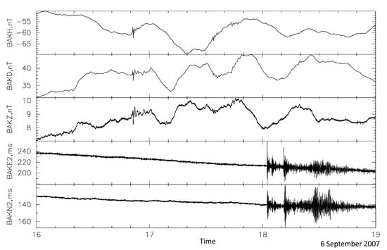 Variations of the Earth’s tilt and magnetic field at the stage of preparation and development of the teleseismic event with a magnitude of 6 (area of Taiwan Island, 6 September 2007), registered in laboratory No. 2: BAKH, BAKD, BAKZ—data of the magnetic variometer, BAKN2, BAKE2—data of quartz tiltmeters through the “North–South” and “East–West” channels, respectively [].