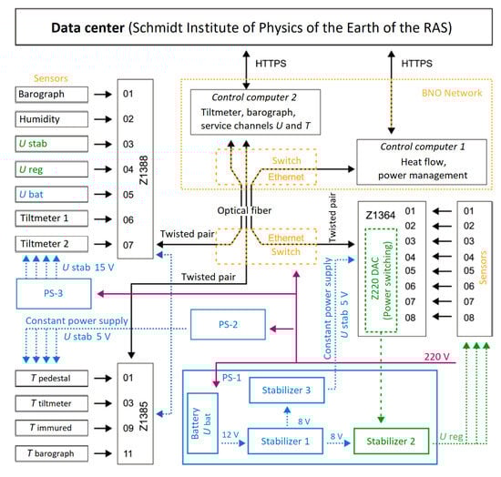 The digital registration system of the North Caucasus Geophysical Observatory is realized on the basis of 24-bit ADC modules “ZET 220” manufactured by Zetlab© company (Russia, Moscow, Zelenograd). One device has 16 in-phase (8 differential) inputs. The modules are located in close proximity to sensors and geophysical instruments. To control their operation and record data, servers based on personal computers are used (Figure 17—control computers 1 and 2). However, the climatic conditions in the deep underground tunnel are shocking for typical computer systems: no air mass movement, high temperature, and humidity of about 90%. Therefore, the servers are installed in a remote ventilated room ~200 m away from the foundations. It should also be noted that in order to reduce electromagnetic interference to the magnetic variometer, the iron devices are maximally distanced from it, and a shielded twisted pair is used for electrical connections. The control computers are connected to the Internet, which allows for the remote control of their settings and data transmission. Due to the large distance of the server room from the geophysical laboratories where measurements are performed, a fiber optic line is used to connect the servers. A prerequisite for obtaining high-quality data is the inclusion of additional recording channels and special sensors in the equipment. These auxiliary channels (Figure 17) control various service parameters characterizing the state of the environment and equipment, i.e., conditions of measurements. The availability of such data allows us to identify signal distortions that arise due to external influences or changes in the characteristics of the equipment. Analyzing the influence of interfering factors, it is possible to improve metrological characteristics of devices using additional signal processing.