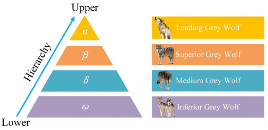 23]. Renowned for its simplicity, rapid convergence, minimal parameter setup, and ease of implementation, this algorithm offers significant advantages. Within the GWO algorithm, the gray wolf pack is structured into four hierarchies, denoted as