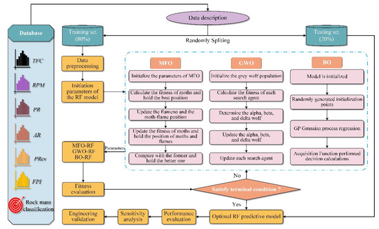 The aim of this investigation is to develop a classification predictive model for surrounding rock in TBM operations. To achieve this, three hybrid models—GWO-RF, MFO-RF, and BO-RF—are constructed by adjusting the hyperparameters of the RF using two metaheuristic algorithms (MFO and GWO) and BO. Despite differences in optimization approaches between the metaheuristic algorithms and the BO algorithm, they share similar steps in optimizing the RF models, as illustrated in