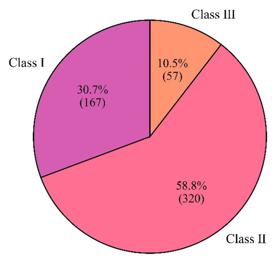 Figure 5. Notably, there exists an imbalance in sample distribution among the classes, particularly evident in the differing number of class II and class III samples, with a ratio reaching 5.6:1. Such class imbalance can introduce biases in machine learning models, where the more frequent classes tend to dominate during training, potentially resulting in inferior predictions for less represented classes.
