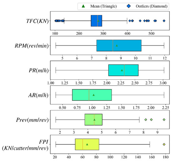 Figure 7 illustrates box plots for the TBM tunneling data, showcasing statistical metrics such as the median, upper and lower quartiles, and outliers. Outliers are determined based on the statistical principles of the boxplot. The normal range is defined by the quartiles (Q1 and Q3) and the interquartile range (IQR). Data outside the range from Q1 − 1.5 × IQR to Q3 + 1.5 × IQR are considered outliers, typically indicated as outliers in the box plot. Some variables exhibit outliers, notably TFC, which were retained in this study despite their unidentified origins, considering their potential informational value.