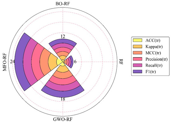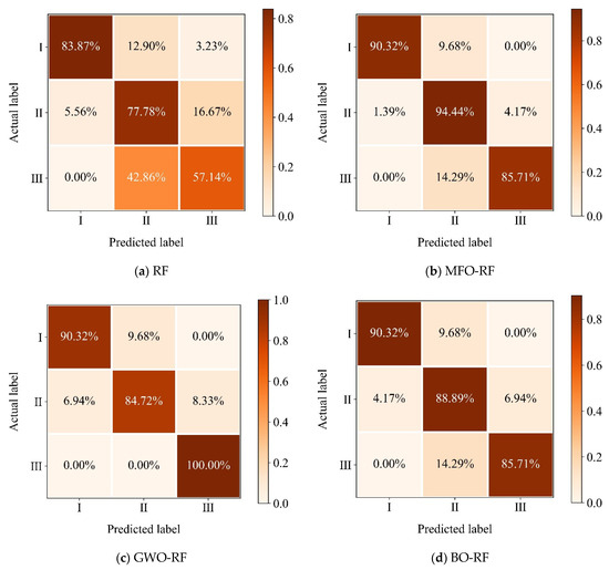 Figure 17b, the GWO-RF model performs similarly to the MFO-RF and BO-RF models in ranking the performance of each surrounding rock class, but the performance is slightly worse. Overall, the hybrid models demonstrate satisfactory prediction performance, notably the consistent performance of MFO-RF and BO-RF models, both achieving accuracies of 0.879. These results confirm the engineering applicability of the developed models.