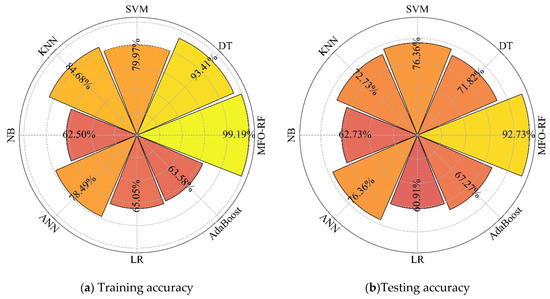 (1) Comparative analysis revealed that all developed hybrid models outperformed the unoptimized RF model in prediction accuracy. Among them, the MFO-RF model exhibited the highest prediction performance, achieving 0.992 training accuracy and 0.927 testing accuracy. Furthermore, compared to other commonly employed machine learning models, the MFO-RF model still showed superior learning and generalization performance in the prediction of surrounding rock classification.