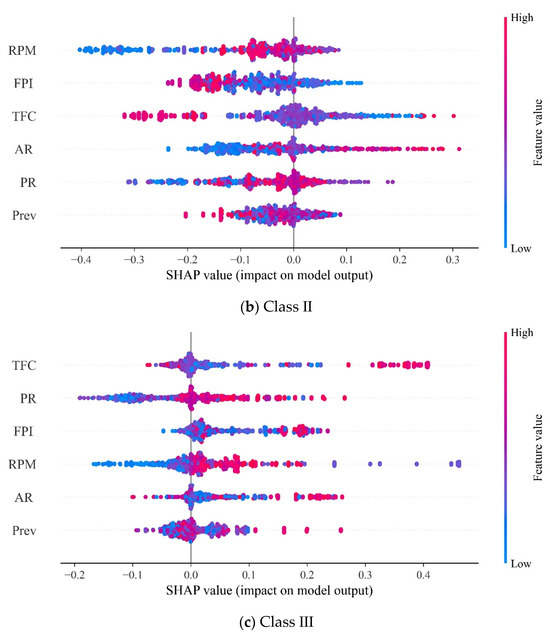 (2) SHAP was introduced to interpret the MFO-RF model. PR, AR, and RPM were identified as the key input parameters for surrounding rock classification prediction, and the effects of these key parameters on predicting different rock mass classes were analyzed.