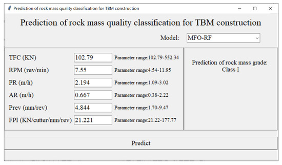 Figure 18. The interface consists of input parameters, a prediction model selection, and output results. Users simply input prediction index values and select the desired prediction model to obtain corresponding surrounding rock classifications.