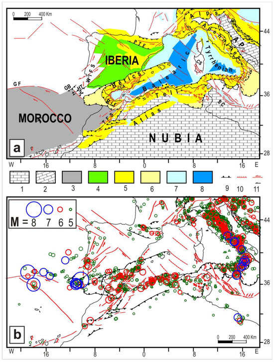 (a) Tectonic setting of the study area. (1, 2) Nubian and Adriatic continental domains. (3) Morocco block. (4) Iberian block. (5) Main orogenic belts. (6) Recent accretionary zones (7, 8). Zones affected by moderate and intense crustal thinning, respectively. (9, 10, 11) Compressional, extensional, and strike-slip tectonic features. AP = Adriatic plate, CCA = Cadiz–Crevillente–Alicante fault, CS = Corsica–Sardinia block, GF = Gloria fault, GB = Gorringe bank, HT = Horseshoe thrust, PTF = Pyrenean thrust front, SC = Sicily Channel, TFS = Transmoroccan fault system, WIFS = Western Iberian fault system. (b) Main earthquakes that occurred in the study area since 1000 A.D. In green, the events with M < 6; in red, events with 6 ≤ M < 7; and in blue, events with M ≥ 7. Data sources from [9,10,11,12,13,14,15,16,17,18,19,20,21,22,23,24] and research institutions for seismology (IRIS), available at http://ds.iris.edu/ieb/, accessed on 1 November 2024.