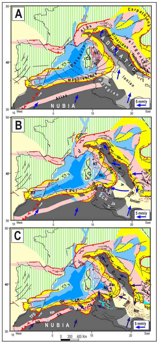 Neogene–Quaternary evolution of the central and western Mediterranean regions. (A) Late Miocene. NT = Northern Tyrrhenian. (B) Middle–Late Pliocene. Ad = Adventure wedge, Ca = Campidano Graben, Eg = Egadi fault, Ja = Jarrafa fault, NAp = Northern Apennines, SAp = Southern Apennines, Sc = Sciacca fault, SCH = Sicily Channel, SR = Scicli–Ragusa fault, SV = Schio–Vicenza fault, Tr = Tripolitania fault, Va = Vavilov basin, VHM = Victor Hensen–Medina fault. (C) Pleistocene. Au = Aures, CP = Calabria–Peloritani wedge, GK = Greater Kabylia, HA = High Atlas, Ho = Hodna basin, HP = High Plateau, LK = Lesser Kabylia, Ma = Marsili basin, MR = Mediterranean Ridge, Pa = Palinuro fault, SA = Saharan Atlas, TA = Tunisian Atlas, Ta = Taormina fault, TFS = Transmoroccan fault system. Colors, symbols, and other abbreviations as in Figure 2.