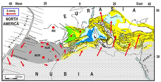 The great resistance opposed by the above collision caused a considerable increase in shear stress between the main Nubia plate and its northwesternmost (blocked) edge. In the middle Miocene, this context led to the activation of a major discontinuity, the sinistral Transmoroccan fault ([48,49,50] and references therein), which has allowed the main Nubia plate to move NNE-ward with respect to its northwestern edge, which became part of the Morocco–North Atlantic plate shown in Figure 4 [1,4,6,7].