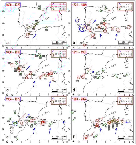 Spatiotemporal distribution of major earthquakes (M ≥ 5.5) in the 6 time intervals indicated in the pictures and described in Section 2. The numbers close to circles indicate the year. In the 1600–1720 time interval, the blue arrow indicates the possible acceleration of western Nubia, triggered by shock in the Transmoroccan discontinuity and in the Betics. In the 1721–1849 interval, the arrows in northern Nubia indicate the possible acceleration of the Tell, triggered by major earthquakes in this belt and promoted by the NE-ward escape of the Iberian block. This context may have continued in the subsequent interval (1850–1910). In the time interval 1911–1953, da minor escape of the Iberian block can be supposed. In the time interval 1954–1979, the minor escape of the Iberian block may continue, while a displacement of the central part of the Tell may occur. The arrow in Tunisia indicates the possible westward displacement of the Adriatic–Pelagian domain induced by the post-1939 jump of Anatolia. In the last time interval, the intense seismicity in the Tell may have been driven by the coeval westward displacement of the Pelagian domain and the NE-ward displacement of Nubia. Sources of seismicity data as in Figure 1.