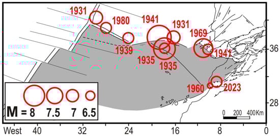 Another comment can be devoted to the seismic activity in the North Atlantic that may have promoted the 1960 (M = 5.7) and 2023 (M = 6.8) earthquakes in the TFS (Figure 6). The series of strong shocks that occurred from 1931 to 1969 along the discontinuity running from Azores to Gibraltar (Terceira ridge, Gloria fault, Gorringe bank, and Horseshoe thrust scarp) suggests that during that time interval, the Morocco plate may have undergone a significant counterclockwise rotation (Figure 4). This implies that the easternmost sector of this plate may have undergone a NW-ward motion, alleviating compression at the TFS, where the 1960 (M = 5.7) and 2023 (M = 6.8) earthquakes took place. One could also take into account the possibility that the increase in stress in the TFS was favored by the NE-ward displacement of northern Nubia, triggered by the intense seismicity which occurred in the Tell since 1954 (Figure 5e,f).