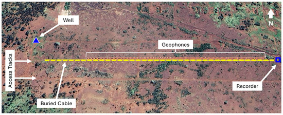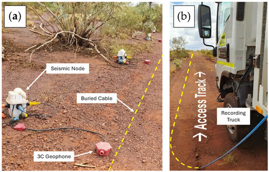 Figure 1 shows a satellite image of the seismic data acquisition site highlighting the locations of the geophones and the DAS cable within the access track to the well location. Figure 2a,b shows images of the field deployment of wireless nodes with 3C geophones on a 2D line along an access track and right above a buried single-mode fiber-optic (SMF) cable connected to a recording truck at the end of the 2D line.