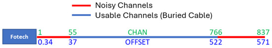 As for the buried DAS cable, geometries were assigned based on tap tests upon connecting the interrogator to the fiber-optic cables and visual inspection of the recorded data. Figure 4 shows the color coding of channels of the surface DAS cable where the red color denotes unburied parts of the fiber-optic cable. The part of the cable usable for subsequent analysis is labeled in blue in Figure 4.