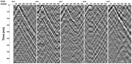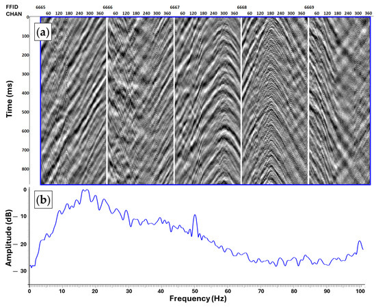 The geophone dataset was harvested from all 132 wireless nodes in SEG-D format. The data were loaded using developed MATLAB scripts, and proper geometry was assigned after dividing it into 30 s chunks. The data were then converted to SEG-Y format for subsequent processing steps and visualized using the RadExPro software package. Figure 5a shows a zoomed view (nine hundred milliseconds) from five consecutive gathers of (30 s long) raw geophone data. Various seismic passive events were observed on the seismograms, related to traffic around drilling operations or a nearby highway. The recorded noise data is relatively broadband, starting from around 5 Hz and with a dominant frequency of around 17 Hz, as shown in Figure 5b.
