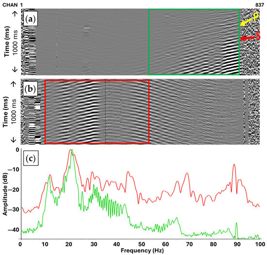 On the other hand, the DAS dataset was recorded by an interrogator in its native HDF5 format. Data were visualized using the RadExPro software package, which can read and handle the DAS data in native formats. Dedicated MATLAB scripts were developed to read the HDF5 files and then convert them to SEG-Y format for subsequent processing steps. The recorded passive surface seismic data is of reasonable quality, as shown in Figure 6. Figure 6a shows an example of surface passive data on DAS indicating noise from drilling the borehole, while Figure 6b shows some noise from an idling engine. Figure 6c shows the average amplitude spectra over the indicated colored windows in green and red. Both spectra show similar characteristics, with minimum frequencies around 7 Hz and peak frequencies around 22 Hz.