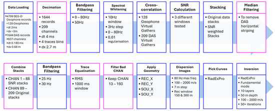 The applied workflow for surface data processing and analysis. Blue steps are common for geophone and DAS data, while magenta steps are unique for DAS.