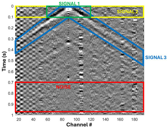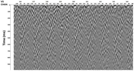 Surface DAS data are noisier than geophone data; thus, selective signal-to-noise stacking enhances data quality. Using the green signal window in Figure 9, the virtual gathers with better-than-average SNR were selected and normalized by their mean RMS amplitude level before stacking them. After stacking, median filtering was applied to the stacked data to remove the common horizontal striping noise in the DAS data.