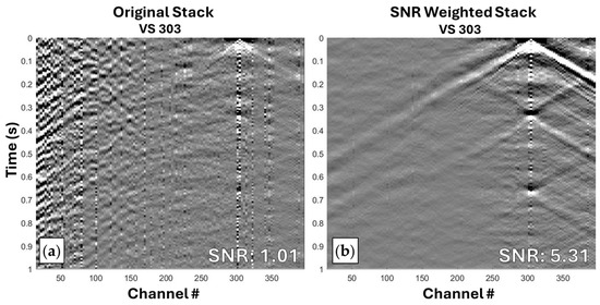 A qualitative comparison for a geophone virtual source gather (a) before and (b) after SNR weighted stacking.