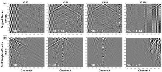 A qualitative comparison for four different DAS virtual source gathers (a) before and (b) after SNR weighted stacking.