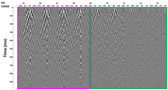 The combined stacked DAS virtual source gathers, composed of the enhanced virtual sources (away from the rig), up to VS 88, as highlighted in magenta, and the remaining original virtual sources (closer to the rig), from VS 89 onward, as highlighted in green.