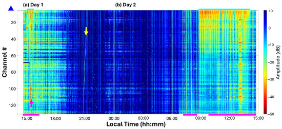 Figure 14 shows amplitude attribute sections computed for all surface geophones over the continuous recording period for each 30 s long record without gaps. Over nine hours during the first acquisition day, Figure 14a shows a detected linear event related to a fast-moving truck moving away from the well, marked by the magenta arrow. Shortly after that, closer to the well location, four major surface activities were recorded by many channels over one hour. This high amplitude noise (closer to the drilling pad) was related to the commencement of drilling operations on the first day. Much later in the evening, around 21:00, another linear event was detected, marked by the yellow arrow, of a fast-moving truck driving toward the well location. Figure 14b shows the continuation of the geophones recording on the second day and capturing the commencement of drilling on the second day around 09:00. Similar but stronger surface activities near the well location were detected. The cyan bars at the top of the plot mark periods of surface drilling activities, while magenta bars at the bottom mark periods of recording overlap with the DAS acquisition. The quiet period in the middle is the nighttime from 7 p.m. to 7 a.m. the next day.