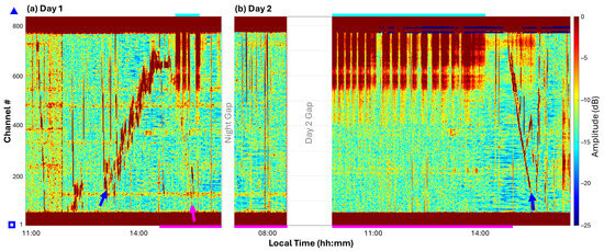 Surface DAS data maximum absolute amplitude section of the (a) first and (b) second acquisition days, highlighting a couple of recording gaps. The blue square marks the location of the DAS interrogator by channel 1, and the blue triangle marks the end of the cable closer to the well location. The magenta bars on the time scale denote recording periods overlapping with the geophone array, while cyan bars at the top mark periods of drilling surface activities. The magenta arrow indicates the same moving vehicle heading away from the rig as detected at the start of geophone recording. The blue arrows mark a detected slow-moving vehicle along the 2D line during the geophone node deployment on the first day heading toward the drilling rig and a fast-moving vehicle moving away from the rig on the second day.