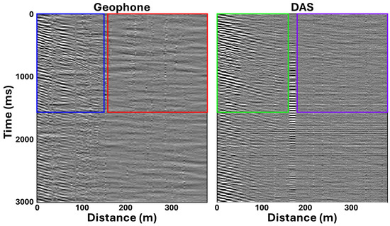 On the other hand, the geophone data are contaminated by spikes of higher frequencies, as each channel was recorded by a single geophone without any array forming, which is evident in the spectra in Figure 17a. The spectra also show a clear 50 Hz mono-frequency on both the geophone and DAS data. However, 60 Hz mono-frequency noise appears only on the DAS data purple and green spectra.
