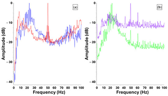 Amplitude spectra for the color-coded windows in Figure 16, (a) where blue and red amplitude spectra are for drilling activity near and away from the rig for geophone data, respectively. (b) While the green and purple amplitude spectra are for DAS channels near and away from the rig, respectively.