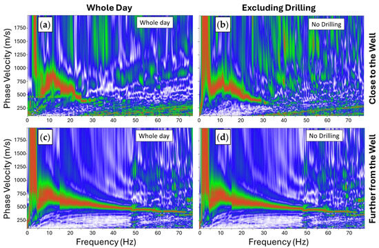 Dispersion images for channels close to the rig (top panels) vs. channels away from the rig (bottom panels). Images (a,c) were calculated from geophone data at all times, while (b,d) were from data excluding drilling time.