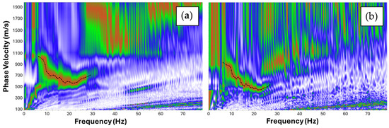 Dispersion images from two different DAS virtual source gathers from (a) the beginning of the DAS 2D line (further from the well) and (b) the end of the DAS 2D line (closer to the well).