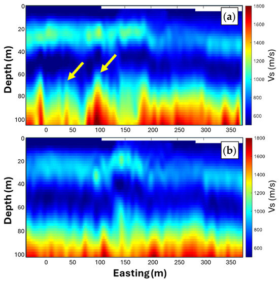Shear wave velocity profiles obtained (a) for all data where yellow arrows highlight areas of unstable inversion, (b) for data without drilling noise.