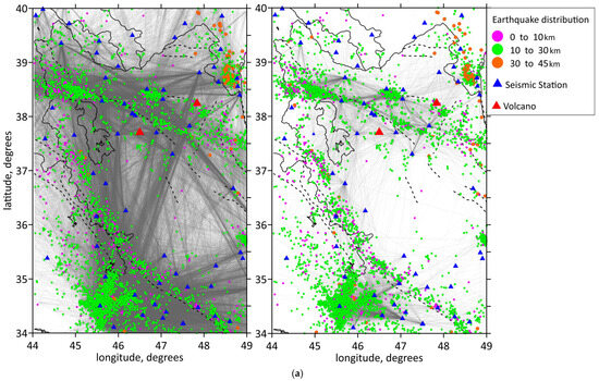 This study utilized arrival time data of P- and S-waves collected from 2006 to 2023 by the Iranian Seismological Center (IRSC). We employed the LOTOS code [48] for simultaneous inversion of 3D distributions of P- and S-wave velocity anomalies and source locations. The dataset used for the tomographic method comprises the arrival times of 110,378 P-waves and 14,485 S-waves from 10,305 events with magnitudes greater than 2.5, recorded by 233 stations. The spatial distribution of earthquakes and stations used in the analysis is illustrated in Figure 3a, where the events are represented according to their depth. The distributions of the P- and S-wave ray coverage as well as the source and station locations are presented in Figure 3a,b.