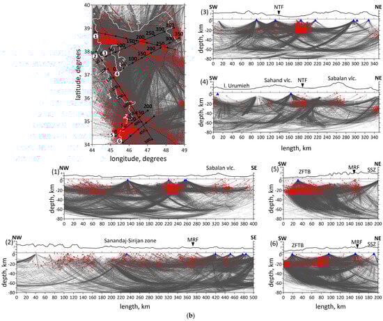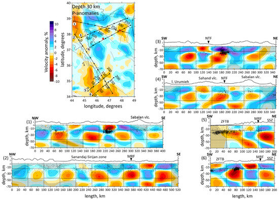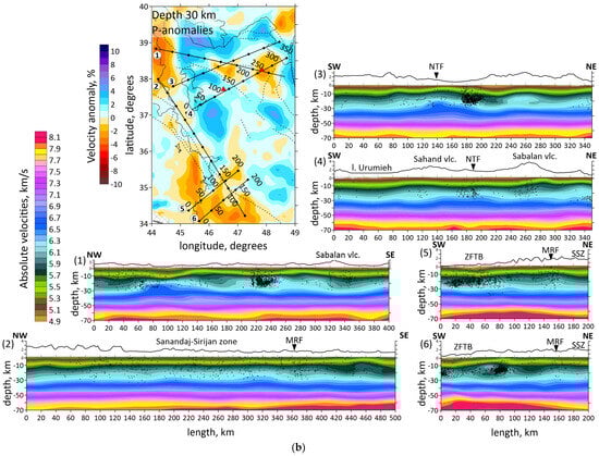 Vertical sections of the P-wave velocity anomalies are given in Figure 6a. Seven vertical sections are located in the most seismically active zones. Moreover, the sections intersect main geological objects of the study region, such as the Urumieh–Dokhtar Magmatic Arc (sections 1, 3 and 4), the Sahand and Sabalan volcanoes (sections 1 and 4), the Main Recent Fault (sections 2, 5 and 6), the Zagros Fold and Thrust Belt and the Sanandaj–Sirjan Zone (sections 2, 5 and 6). The absolute velocities of the P-wave velocities are displayed in Figure 6b.