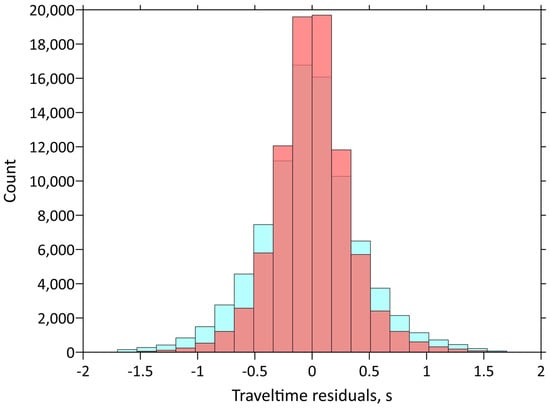 Histograms of P-wave travel-time residuals before (light blue) and after (red) inversion.