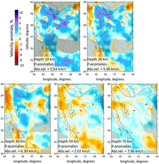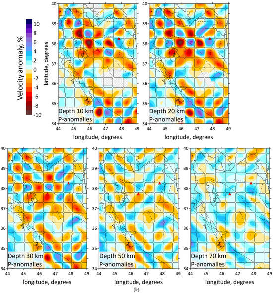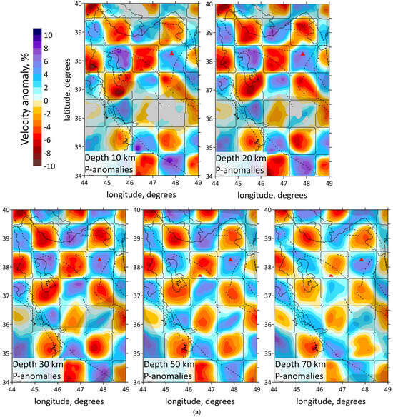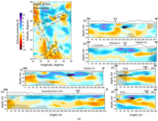The obtained results also highlight major geological features, such as the Sahand and Sabalan volcanoes, clearly distinguished in the seismic structure. According to vertical sections 5 and 6 represented in Figure 6a, and horizontal sections in Figure 5, low velocities down to a depth of 10 km in the Zagros region characterize a high thickness of the sediments. This observation is consistent with the results of [35]: a thick sedimentary cover of about 8 km of Permo–Triassic to Late Cretaceous or Paleocene ages is present beneath the ZFTB. Refs. [8,23] also demonstrated low-velocity anomaly beneath the Zagros region.