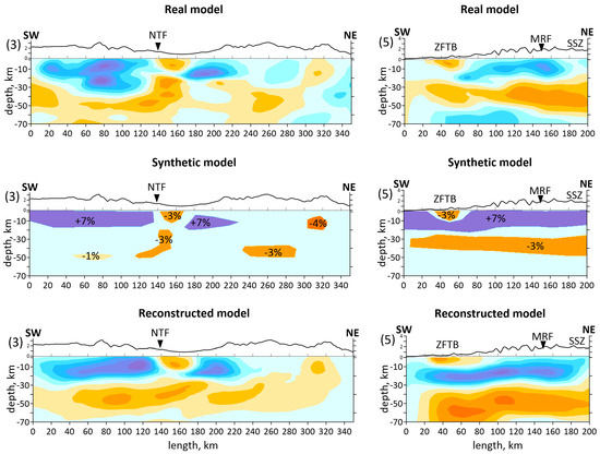 Figure 9 shows a synthetic test with realistic anomalies for vertical sections 3 and 5 to a depth of 70 km. The amplitude and shape of the synthetic anomalies were set in accordance with those observed in the real model. The main objective of the test was as follows: firstly, to assess the influence of the ray configuration on the anomalies; secondly, to understand whether relatively small anomalies in the upper crust can be reconstructed; and thirdly, to understand the general seismic structure of the region. The result of reconstructing the synthetic anomalies allows us to conclude that the ray configuration smashes the anomalies to depth. According to Figure 3b, with the distribution of earthquakes in the crust mainly up to 25–30 km, the ray paths reach up to 80 km. Despite the smashing, the general seismic structure of the studied region is resolved: the upper part of the crust is characterized by high-velocity anomalies, and the lower part by low-velocity ones. All interpreted anomalies, even the smallest ones such as the low-velocity anomaly under NTF (section 3) and under ZFTB (section 5), are reconstructed.