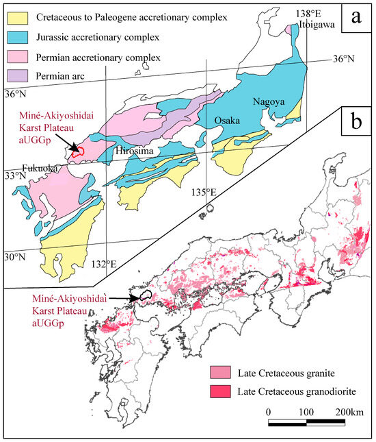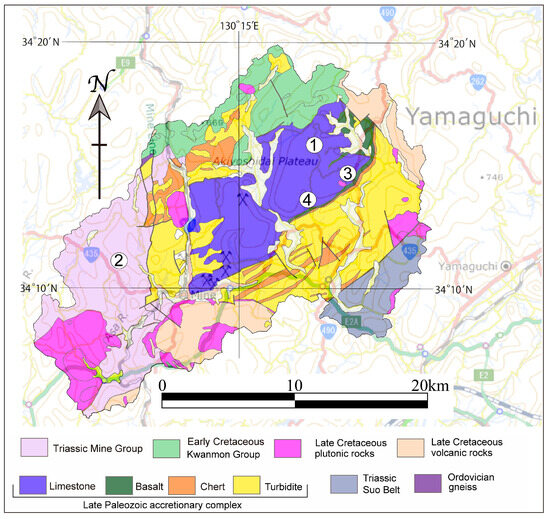 The Miné-Akiyoshidai Karst Plateau aUGGp is located at the west of the Japanese Islands (Figure 1). The geological basement of the Japanese Island is mainly composed of accretionary complexes of the Permian, Jurassic, Cretaceous, and Paleogene periods, which are intruded by Mesozoic and Cenozoic plutonic rocks [34,35,36,37]. The Miné-Akiyoshidai Karst Plateau aUGGp is mainly underlain by a Permian accretionary complex and Cretaceous intrusive rocks as basement rocks, which are widely distributed in the western part of the Japanese Islands (Figure 2).