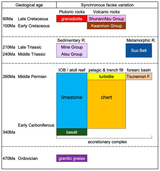 Thus, fragments of submarine volcanoes, limestone of volcanic island origin, chert from deep-sea floors, semi-pelagic acidic tuffs and siliceous mudstones, and sandstones/mudstones from trench-filling deposits are collectively referred to as the “Ocean Plate Stratigraphy” [37,43]. These are known as the rock sequences underlying accretionary bodies worldwide. However, it must be understood that the Ocean Plate Stratigraphy is a hypothetical sequence to understand accretionary formation. Nakashima and Sano [72] investigated the lithological changes between limestone and chert and reconstructed the depositional system in the flank of the volcanic seamount. Thus, the rock formations in the Miné-Akiyoshidai Karst Plateau aUGGp area are well-investigated by various researchers as a typical succession of “Ocean Plate Stratigraphy”, which is major components of the Permian accretionary complex of the Akiyoshi Belt.