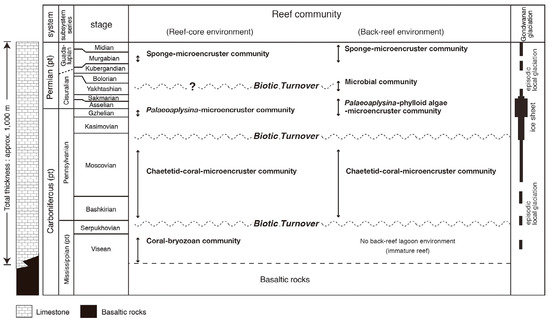 Biotic succession of reef communities on Akiyoshi atolls (after [78]). The column on the left shows the stratigraphy of the Akiyoshi Limestone, while the one on the right represents the advance and retreat of the Gondwanan glaciation.