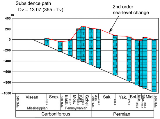 Nakazawa and Ueno [83] and Sano et al. [84] traced the secondary sea level changes in the Late Paleozoic period based on the sequence of Panthalassa Ocean atoll reef carbonate rocks in the Akiyoshi Limestone from the Early Carboniferous period to the Middle Permian period (Figure 9). They revealed the history of long-term sea level changes in the Late Paleozoic period based on variations in the estimated subsidence of seamounts due to oceanic plate cooling and accumulation rates of carbonate rocks. A gradual long-term sea level rise began shortly after the low-sea-level period of the Bashkirian age, following the Mid-Carboniferous boundary. This sea level rise increased significantly during the Moscovian period. Subsequently, from the Kasimovian period to the Asselian period, a stable high-sea-level period ensued. From the Sakmarian period, the sea level gradually decreased, stabilizing in the Artinskian period. This stable sea level was maintained until the Midianian period, but a minor sea level rise of about 55 to 70 m is evident in the Wordian period. Nakazawa et al. [73] revealed the marine environmental change from the Late Carboniferous period to the Middle Permian period, as well.