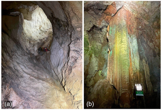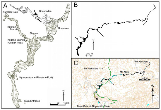 - Murakami, T.; Ishihara, Y.; Kuma, H.; Goto, S.; Murase, T.; Speleological Survey Group of Yamaguchi University. Overview of a New Passage ‘Shusho-den’ Discovered in Akiyoshi-do (cave), Yamaguchi Prefecture, Southwest Japan. J. Speleol. Soc. Jpn. 2020, 45, 41–55. (In Japanese) [Google Scholar]