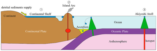 The Akiyoshi Limestone has been studied as calcareous deposits in a fixed geosynclinal basin since the early 1900s, but with the emergence of plate tectonics theory in the 1960s, interpretations based on plate movements have been advanced. Sano and Kanmera [41] revealed that limestone originates from atolls formed on seamounts born in the middle of the huge ocean. Wakita [47] clarified that underwater volcanoes formed by magma from hot plates approximately 340 million years ago on oceanic plates formed at mid-ocean ridges about 370 million years ago (Late Devonian period) serve as the foundation for atoll reefs (Figure 10 and Figure 11). Geochemical studies on the basalt forming the foundation of atoll reefs have shown that it is oceanic island basalt [85,86,87]. Additionally, it has been found that these atoll reefs continued to grow for approximately 80 million years and eventually, around 260 million years ago, detached from seamounts at the convergent boundaries along proto-Japan, forming a Permian accretionary complex along with pelagic deposits, such as chert, and with trench turbidite [43].