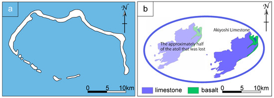 - Sano, H.; Kanmera, K. Paleogeographic reconstruction of accreted oceanic rocks, Akiyoshi, southwest Japan. Geology 1988, 16, 600–603. [Google Scholar] [CrossRef]